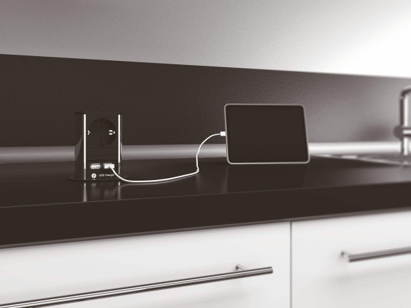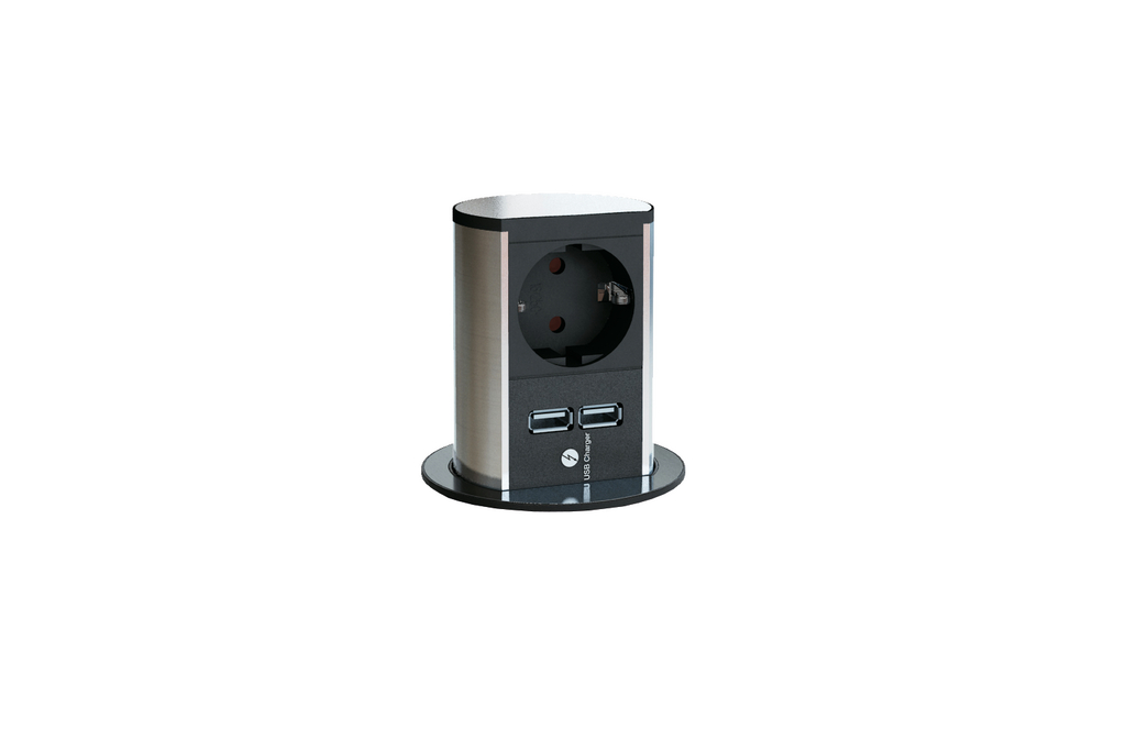 Stromanschluss auf kleinsten Raum versenkbar. Das ist die Steckdosenleiste Elevator.