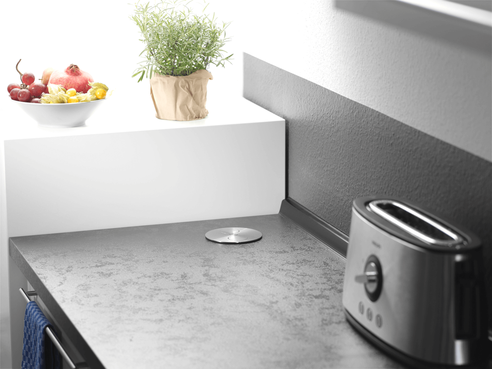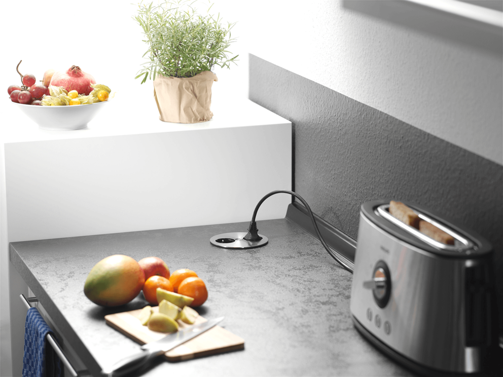 Die Steckdose für Küche, Büro oder Wohnraum. Doppelsteckdose mit geringer Bauhöhe von nur 40 mm, daher ist auch ein Einbau über Schubkästen möglich. Die hochwertige Drehscheibe öffnet oder schließt die Steckdose nach Bedarf.