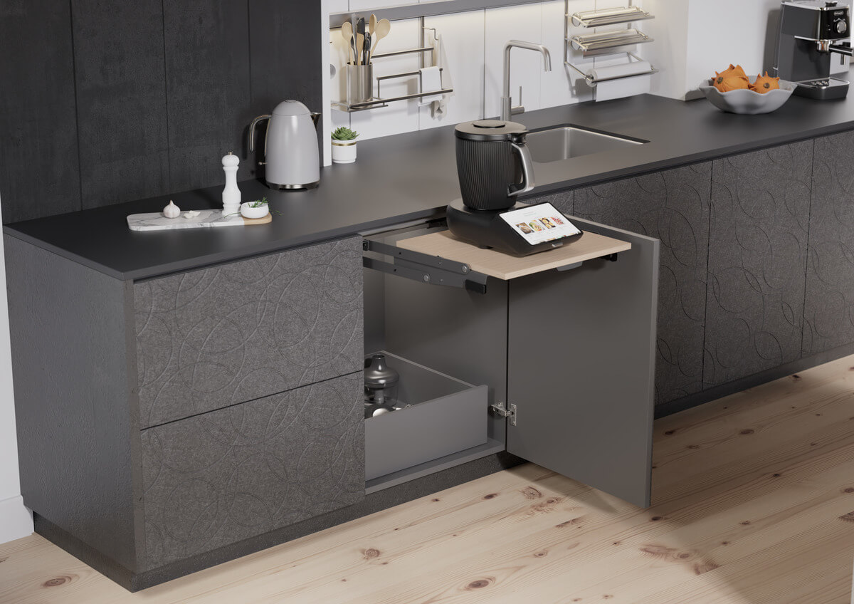 Schwenkbeschlag für Brotmaschinen, Haushaltsmaschinen, Airfryer und vielem mehr. Stabil und komfortabel, für Schrankbreiten 40,0 bis 60,0 cm.