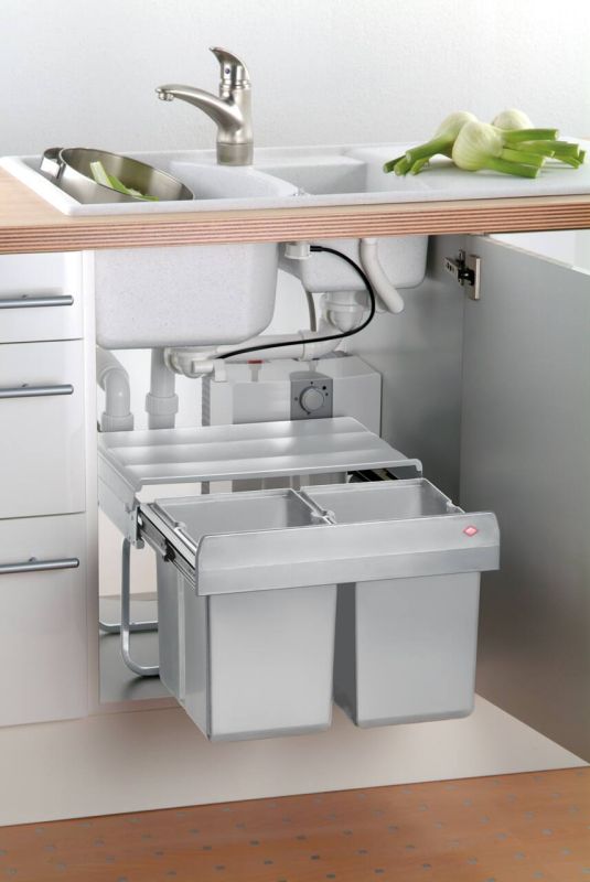 Raumspar-Abfallsammler mit Vollauszugtechnik für Drehtüren. Optimal zum Einsatz in Schränken mit Heißwassergeräten etc.