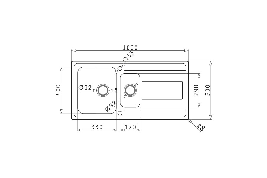 - 2 Hahnlöcher (Armatur u. Excenter)