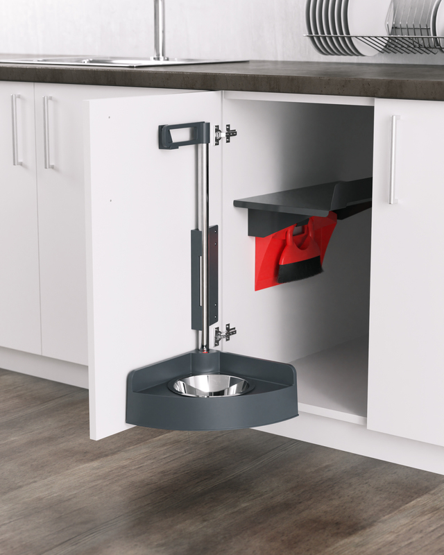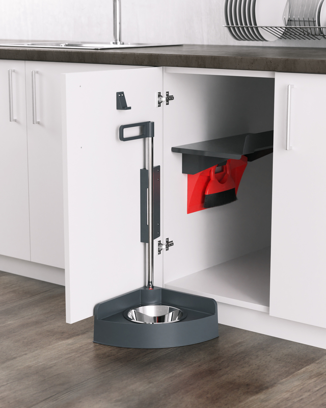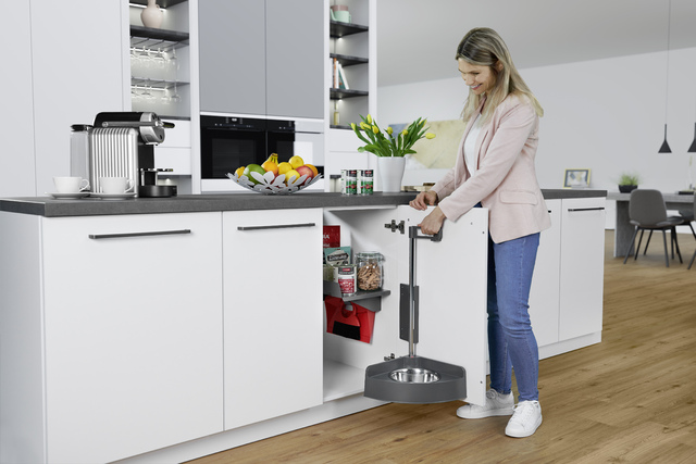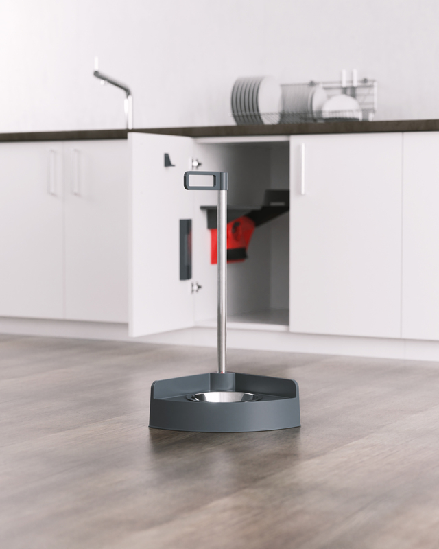 Das Futtermodul wird an der Schranktür befestigt und kann nach dem Öffnen der Tür durch eine einfache Drehbewegung auf den Boden abgesenkt werden. Nach der Fütterung wird das Modul einfach wieder hochgezogen und weggeklappt. Die ganze Einheit kann auch problemlos ausgehängt und transportiert werden - zum Beispiel an eine andere Futterstelle.