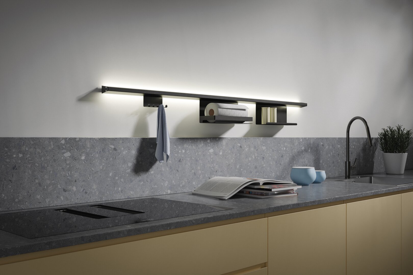 Das transForm Wandelement ist mit seiner indirekten Beleuchtung ein Blickfang in jedem Raum. Das System kann beliebig mit Zubehör wir Gläserhalter, Küchenrollenhalter, Hakenleisten, und Ablagen ergänzt werden.
