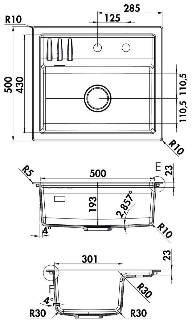 - Ausschnittmaß ca. 55,6 x 48,6 cm (Einbauspüle), auch verwendbar in Kombination mit Heißwasser-Armaturen (+/–95 °C)