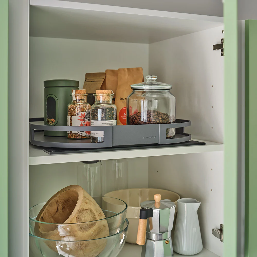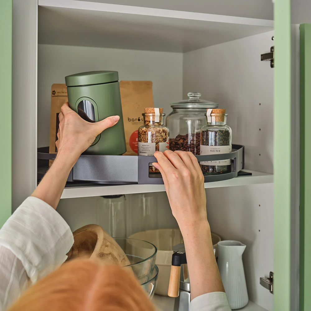 Mit dem drehbaren Boden TurnMotion kommen Sie auch an die hinteren Sachen in Ihrem Vorratsschrank. Der Boden lässt sich um 360° drehen und bringt das Hintere nach vorne.